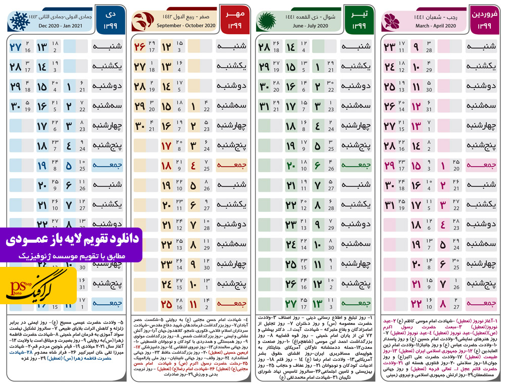تمامی تقویم های سال 1399 مطابق تقویم موسسه ژئوفیزیک دانشگاه تهران است و چندین بار بررسی شده است ولی بررسی نهایی آن قبل از چاپ بر عهده خریدار است و سایت در قبال آن مسئولیتی ندارد.